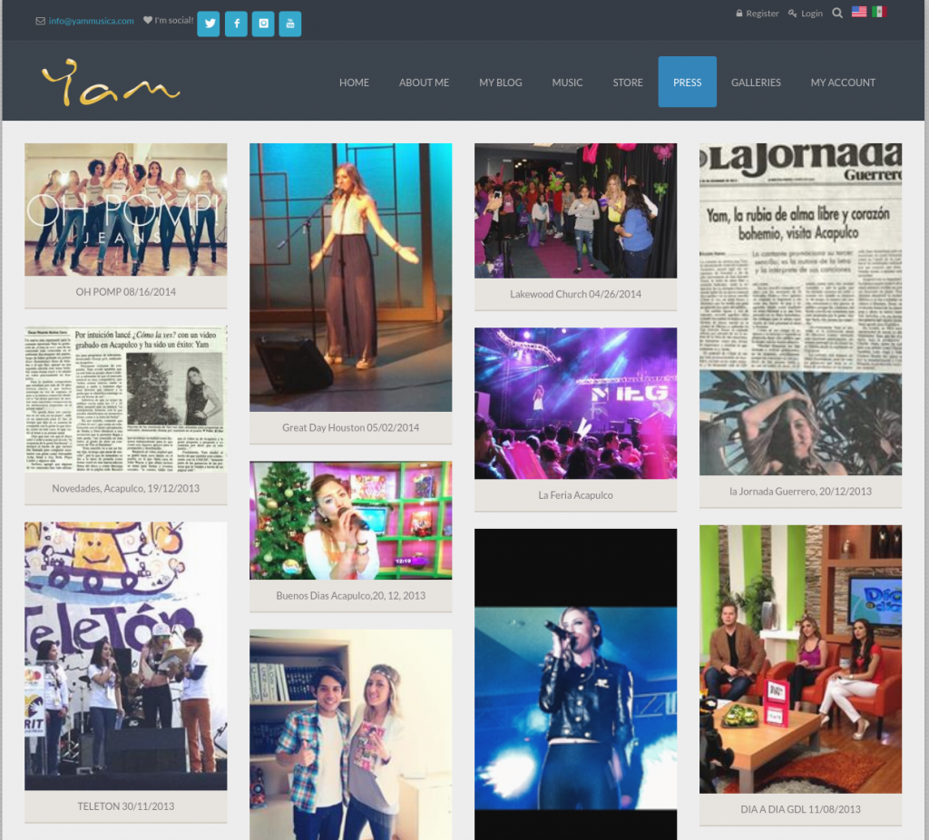 The website of the Mexican singer and artist Yam. We created a custom press page, a custom HTML5 music player that lets you listen to part of the song and purchase full songs, but also download selected full free tracks. It includes a shopping cart for the bracelets Yam designs. All this on a multilingual website. Make sure you listen to her songs below!